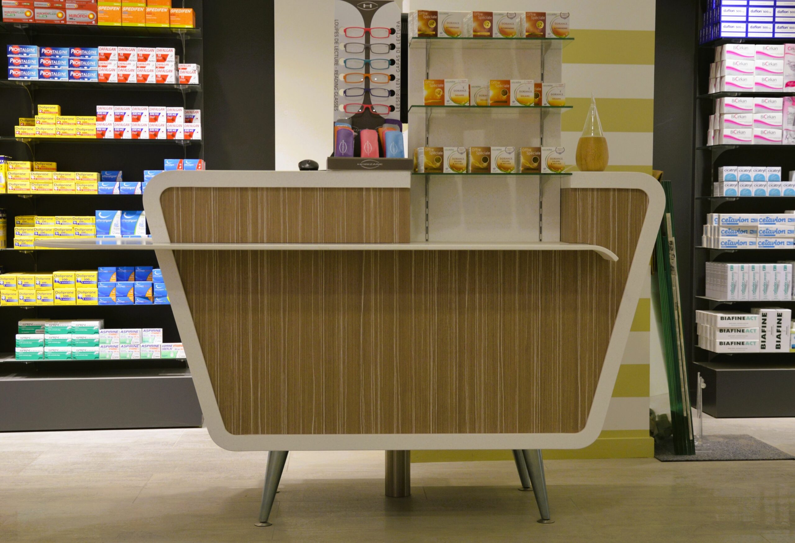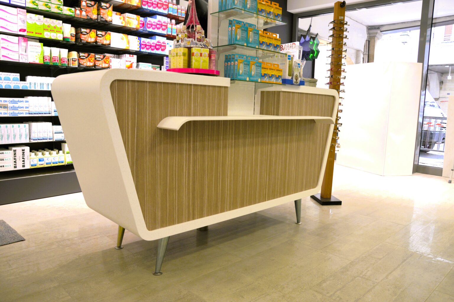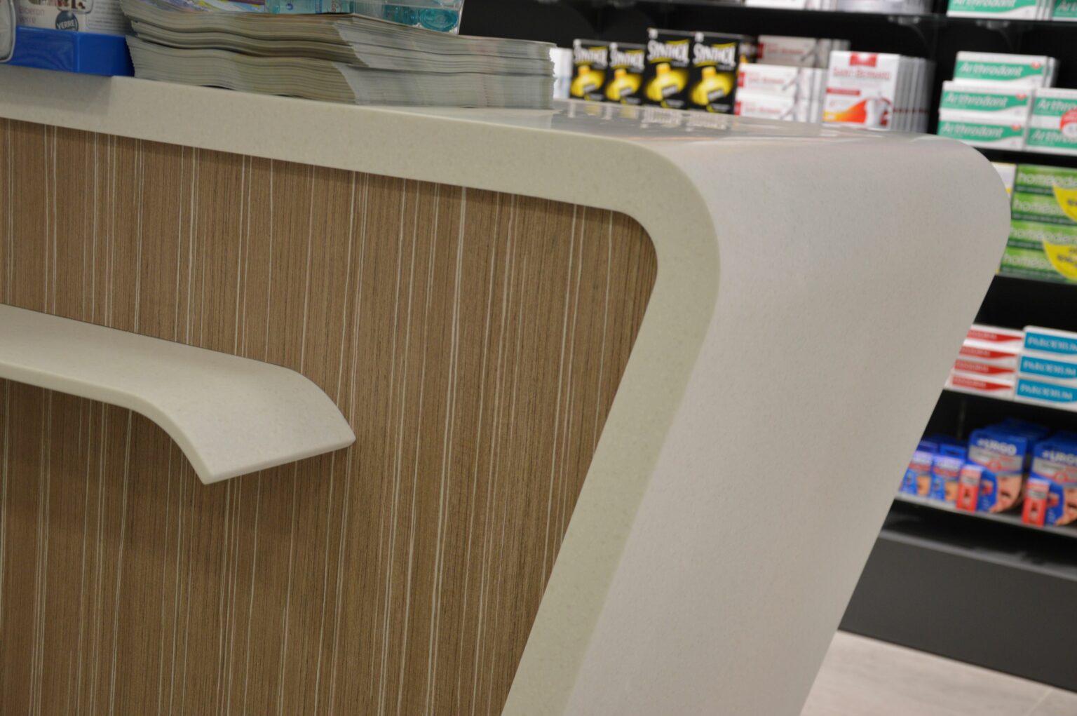 Comptoir de Pharmacie cintré avec un habillage plaqué chêne